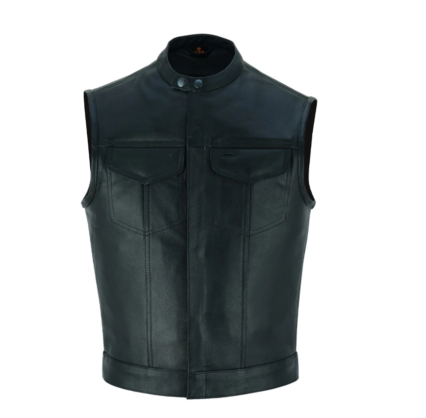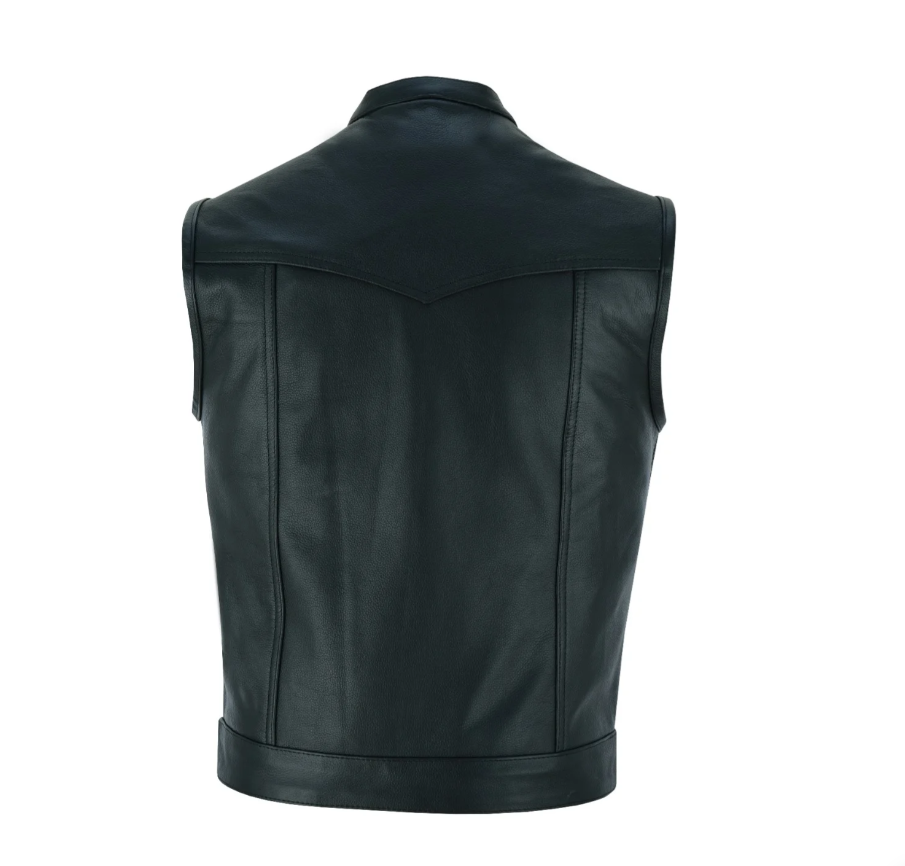 FM черный мотоциклетный кожаный жилет с пуговицами и карманами - 100% натуральная, легкая, премиальная, байкерская, клубная жилетка из воловьей кожи с 5 застежками на кнопках.1) цвет: черный2) натуральная кожа толщиной 1,1-1,2мм3) узкие проймы4)Скрытая/скрытая застежка на пять передних кнопок5)Большая доступная задняя панель для крепления клубных нашивок или вышивки6) два наружных три внутренних кармана7)Воротник-стойка8) размерный ряд XS-7XL