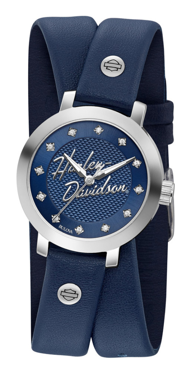 Синий циферблат с великолепными метками из настоящих кристаллов Swarovski®. Корпус из нержавеющей стали серебристого цвета. Синий кожаный ремешок с двойной обмоткой. Водонепроницаемость до 50 м/165 футов (5 ATM).Кварцевые часы Harley-Davidson® от Bulova, созданные, чтобы выдержать любые испытания, отражают бескомпромиссное стремление к совершенству двух самых уважаемых компаний Америки.