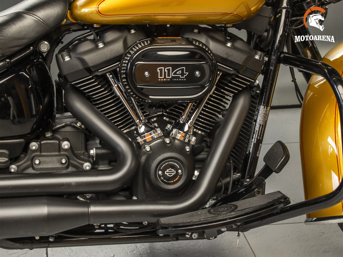 Softail Heritage Classic отличается плавным и уверенным ходом. Подвеска мягко сглаживает неровности дороги, а двигатель Milwaukee-Eight 114 обеспечивает мощный, но контролируемый крутящий момент в широком диапазоне оборотов. Модель подходит как для неспешных городских поездок, так и для долгих маршрутов по трассе.